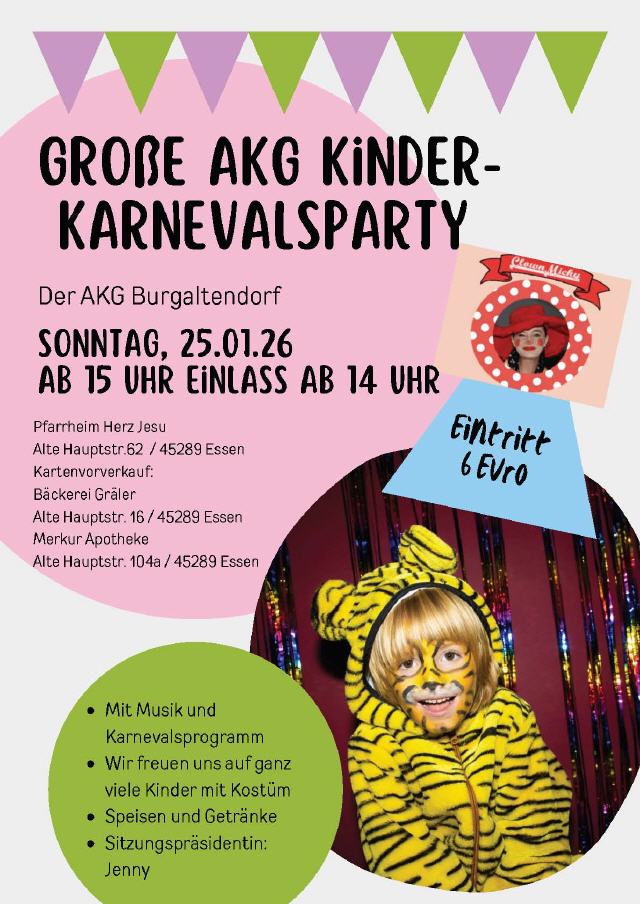 Die 1. Große Karnevalsgesellschaft AKG Burgaltendorf 1951 e.V. wurde von den Mitgliedern des Kirchenchores Cäcilia in Altendorf Ruhr gegründet. Der Verein hat derzeit über 100 Mitglieder.
